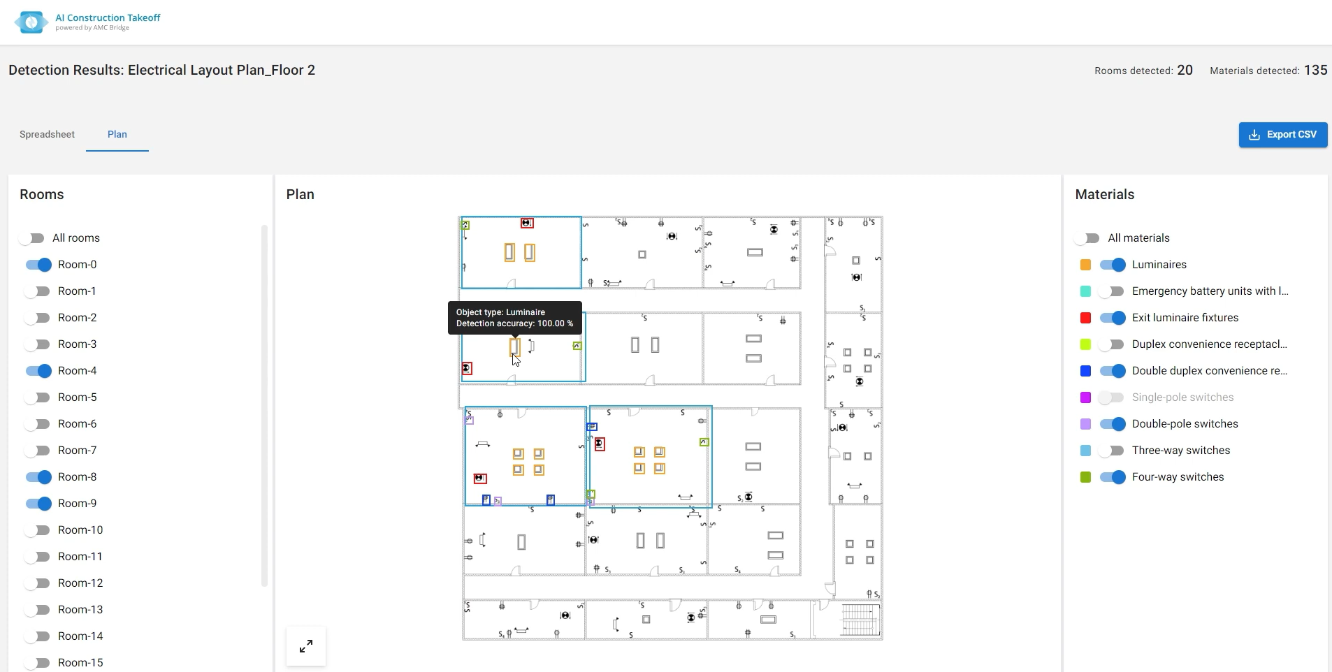 Automates the detection of predefined symbols in electrical construction drawings and calculates room square footage. This streamlines the takeoff process, improves planning and maintenance, and enhances accuracy in construction and facility management.